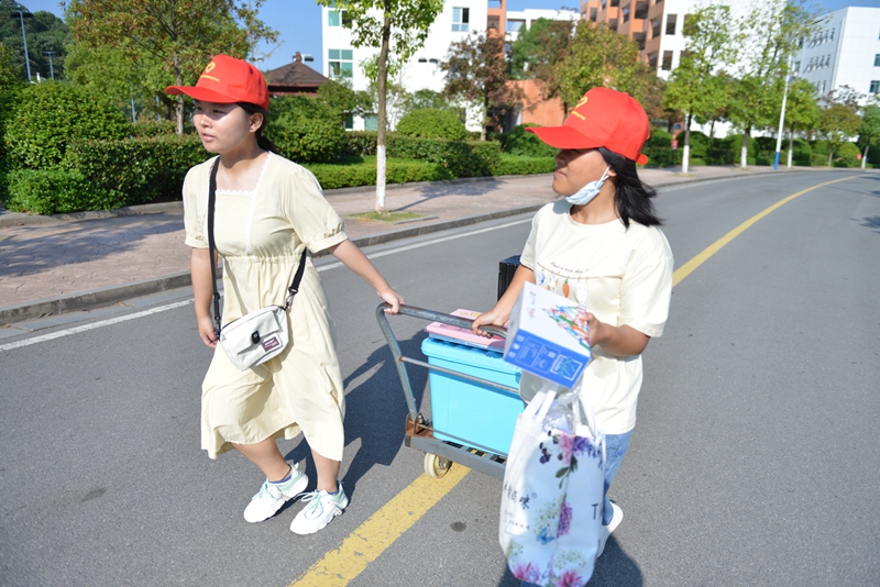 校门口,学校领导等候迎接新生入学,并走访各新生报到点,叮嘱相关负责人及工作人员要严格按照疫情防控要求,切实做好此次迎新工作。报到点,校领导细致询问报到事宜,为学生掂量行李重量,慰问现场工作人员和志愿者。工作人员耐心引导新生们办理入校报到手续。宿舍里,后勤部门贴心地准备了“爱心小拖车”为新生们搬运生活物品,并将统一购置的床品、生活物资提前摆放在学生宿舍铺位,让学生能拎包即入住,尽快适应学校新生活。