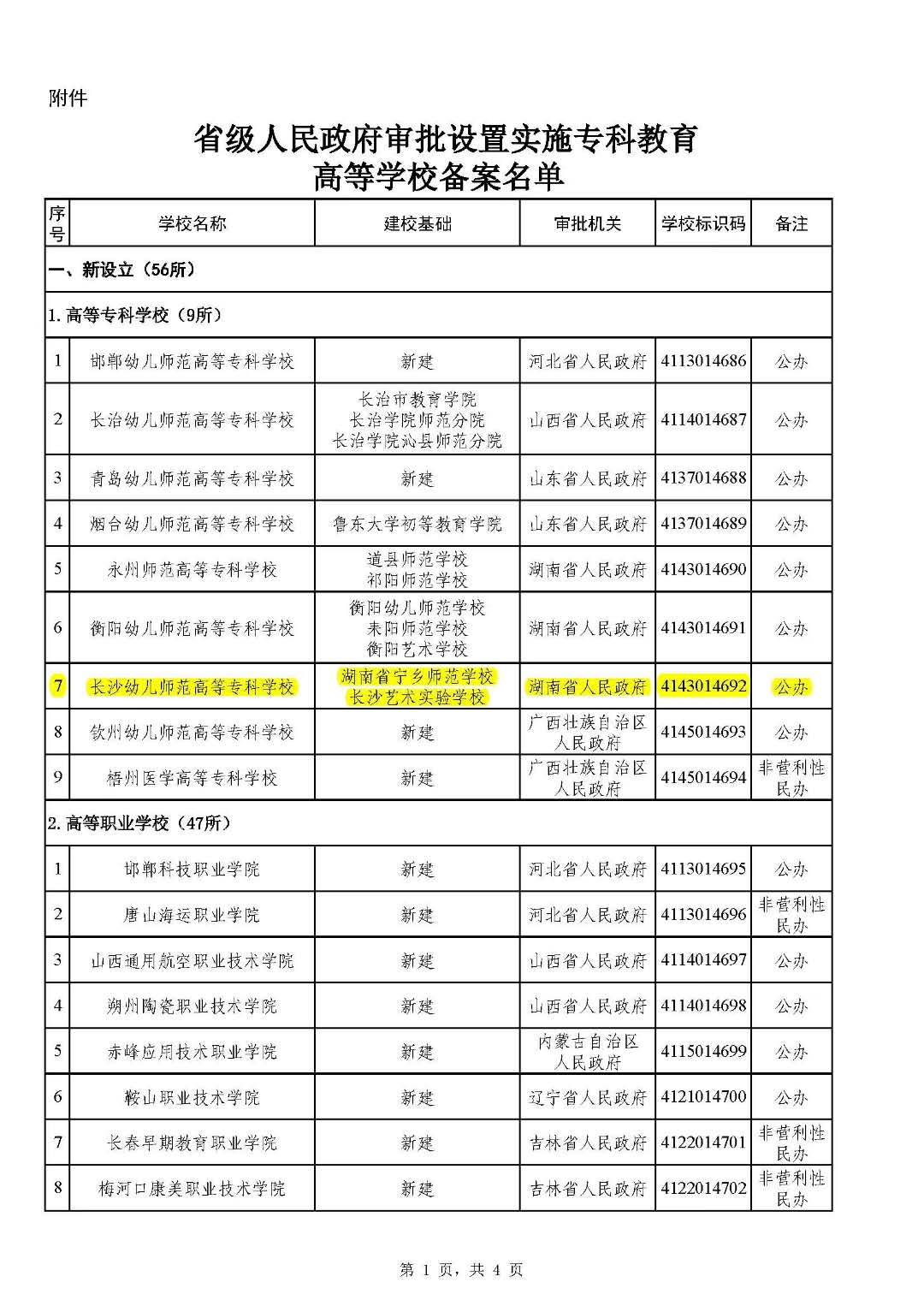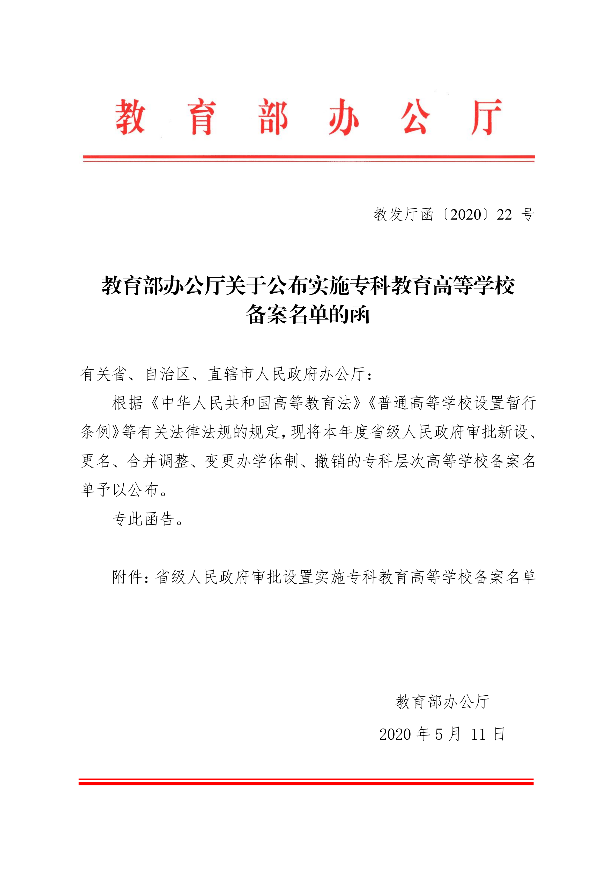 2020年5月11日,教育部办公厅下发《关于公布实施专科教育高等学校备案名单的函》(教发厅函〔2020〕22 号),公布本年度省级人民政府审批新设、更名、合并调整、变更办学体制、撤销的专科层次高等学校备案名单,神彩争霸8安卓下老版本位列其中。学校属于专科层次的高等学校,纳入普通高等学校序列。