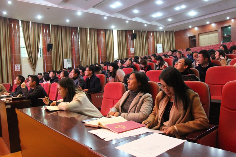 为落实全面从严治党总要求,抓实“基层党建质量年”建设活动, 11月19日,学校在汇智厅召开全校党员大会,党委书记张国斌上主题为《加强新时代基层党组织建设——推进党支部“五化”建设和党员积分管理》的党课,全校110余名党员参加,党课由校长郭正良主持。
