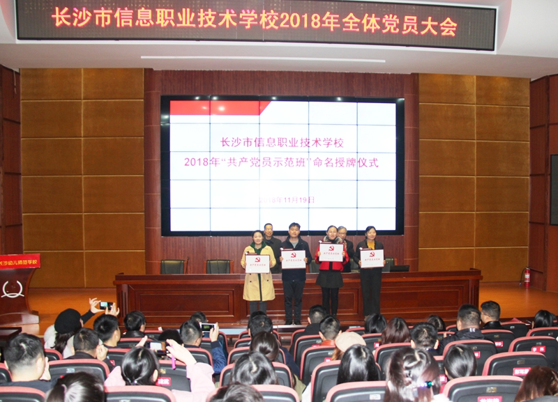 大会还举行了2018年度“共产党员示范班”命名授牌仪式,向1701班、1705班、1708班和1713班4个党员示范班主任授牌。