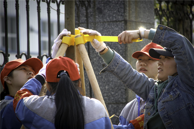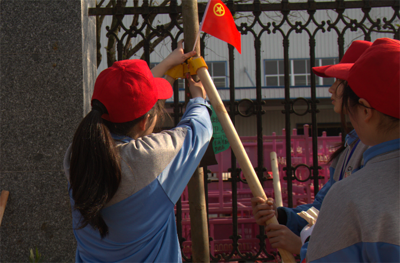 今年的植树活动新增了两个创意,一是志愿者们为每一颗苗木精心制作了卡片;二是志愿者们带着一面面小小的团旗出行,植完树后将团旗和卡片都留在了小树上,号召全民参与蓝天保卫战,凸显团员志愿者的示范引领作用。现场的记者朋友及其他单位志愿者纷纷为我校两个创意点赞。