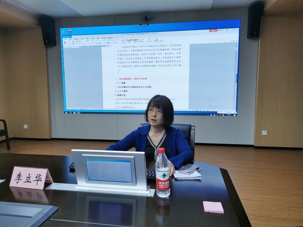 会议邀请马克思主义学院院长李立华教授做了专题讲座。她围绕湖南省第十届辅导员素质能力大赛的理论基础知识部分进行了分析与分享,主要从党的创新理论与路线方针政策、五史、时事政治等五个方面进行了生动的讲述与概括。讲座结束后,大家纷纷表示,通过李教授的点拨,枯燥难懂的理论知识变得有味。本次讲座让老师们迅速厘清了思路、打开了脑洞、增长了知识。