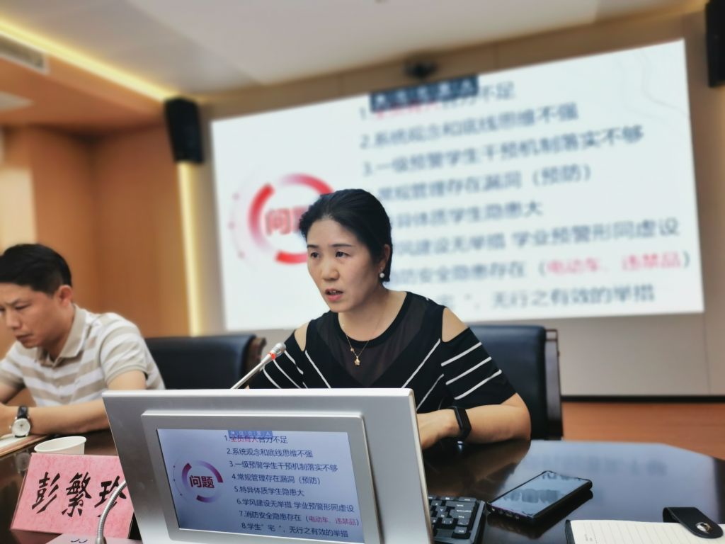 学保处处长彭繁珍以“做学生工作引路人,扣好人生第一粒扣子”为主题,就学生工作情况进行总结复盘、规划部署,重点将2022年搬迁到新校区以来学生日常管理工作中的应急突发事件等六类情况,按学院、时间节点分类进行了数据分析和总结。同时提出了学生工作存在的困难和问题,要求大家做到全员“四进”,推动重心下移;引导学生“四出”,促进健康成长;落实安全教育、确保校园平安稳定。