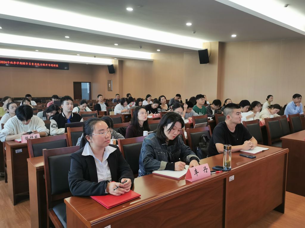为进一步加强我校辅导员队伍建设,提升辅导员工作能力和业务水平,促进辅导员职业化、专业化发展,提高学生工作管理与服务质量。 10月17日下午,我校在道馨楼503会议室举行2024年秋季学期辅导员素质能力提升系列专题讲座。学生工作与安全保卫处·团委相关人员、各二级学院德育副院长及全体专兼职辅导员参加培训。讲座由学生工作与安全保卫处副处长邹雯辉主持。