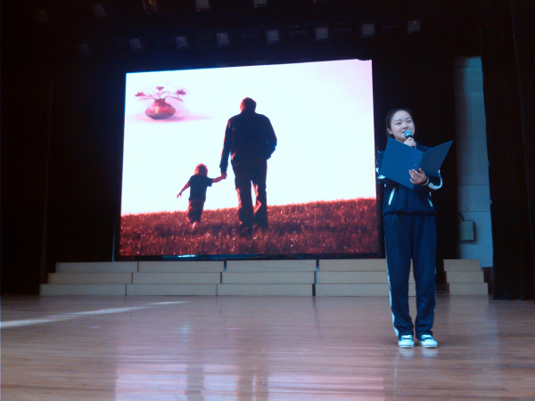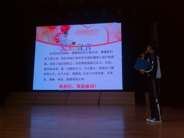 首先,王惦同学通过自己的亲身经历回顾了其父母亲照料自己的点点滴滴,不管是教自己穿衣服、给自己盖被子还是经常带着自己出入诊所看病等,一件件小事,一个个画面,都饱含着父母亲对自己的深深爱意。这种不计薪酬,心甘情愿,无怨无悔地为对方付出的事情只有父母亲才能做到。但让人痛心的是,即使有些人与父母亲在一起生活了十几年,却不知道自己父母亲的生日,不知道父母亲的需要是什么。一味地用物质来填补对父母情感亏欠的空白,这充分地说明这些人与父母沟通太少,情感融入度不高,心理距离在逐渐拉大,如今这样的问题已经逐渐成为了一个社会性问题。其次,王惦同学强调,大多数人都知道阳光与温暖,雨露与五谷丰登,水与生命,父母与自己的因果关系,可是到底有多少人能做到及时行孝呢?难道行孝一定要等到“子欲养而亲不待”之时吗?只怕是到那时,泪水与悔恨已经为时晚矣!所以我们应该趁父母健在时,抽时间多回家看看他们,陪他们说说话,给他们洗洗脚,捶捶背,及时提醒他们增减衣裳等。最后,为了践行感恩,王惦同学与在场的全体同学共同约定,用自己的实际行动去尊重、理解、体谅、慰藉自己的父母。