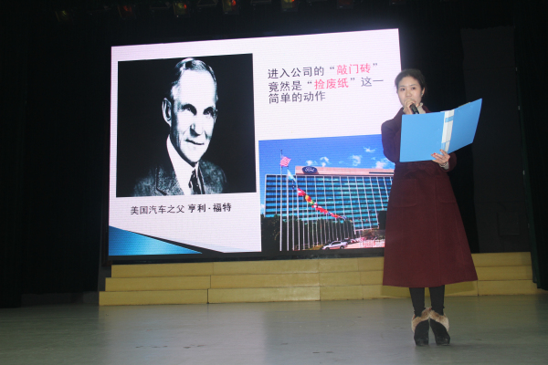 首先,彭老师以时下热播的《锦绣缘》为导入,同时结合化妆品公司员工面试、福特面试和幼师面试三个案例,详细地讲述了一个人在面试过程中注重细节的重要性,她强调,短时间的面试往往很难完整呈现一个人的知识和技能优势,但是,面试中的一些看似不起眼的细节,恰恰反映了他的日常生活习惯,面试官则可以据此间接推断一个人的整体素质。接下来,彭老师就教室、食堂和集会等方面如何注意细节提出了明确的要求和期望,期望同学们平时注意整理自己的书本及学习用具,课后桌椅归位;餐后带走残羹剩饭,并将餐盘送到指定位置;注意自己的个人卫生,做到整洁、干净、大方;集会精神饱满,做个文明的观众。最后,彭老师引用李嘉诚的话与学生共勉,希望全体学生播种思想,注重细节,培养习惯,成就自我。