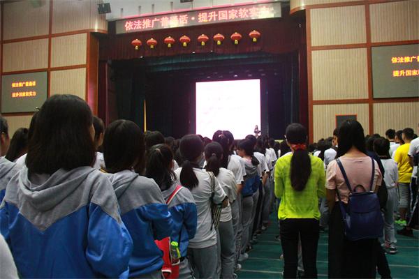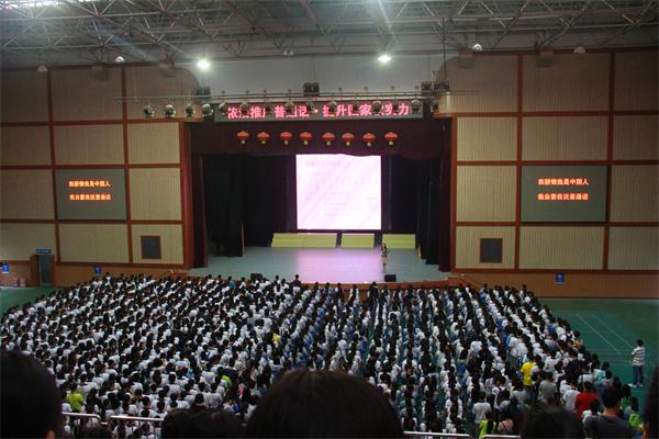 最后,周老师向同学们发起倡议,倡议师生以说普通话、写规范汉字为荣;倡议在校园内开展“啄木鸟”行动,对黑板报、作业等进行检查,发现不规范用字马上进行纠正;倡议各班利用班会课时间举行“学法规、诵经典”等主题班会活动,同事评选出班级推普员,每一周可以由其带领朗诵美文。