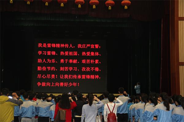 最后,1304班唐玮同学带领大家在国旗下庄严宣誓:“我是雷锋精神传人,我庄严宣誓:学习雷锋,热爱祖国,热爱集体,助人为乐,勇于奉献,艰苦朴素,勤俭节约,刻苦学习,孜孜不倦,尽心尽责。让我们传承雷锋精神,争做向上向善好少年!”。