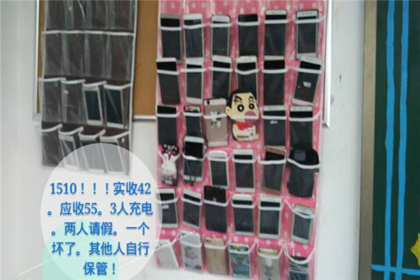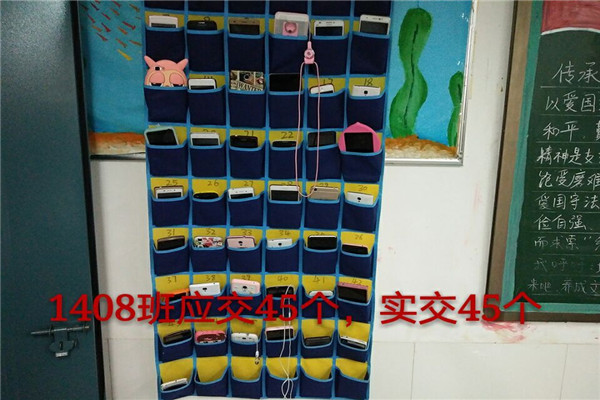 然而,看似简单的“上课收手机下课还手机”手机管理规则,却在实行的时候处处有同学叫难,仿佛离开手机生活就存在遗憾一样。但通过周一升旗仪式《远离手机·回归现实》以及周三主题班会《如何合理使用手机》开展,加上班主任老师的谆谆引导,同学们的思想有了微妙的转变,大家不但慢慢思考手机的用途,也积极配合活动来自我约束。就如1501、1510、1408、1307等班级,虽然一开始会有同学产生抵触的心理,但是经过班干部的动员,许多同学纷纷主动上交手机,手机挂袋也由空空如也到一排排整齐划一;还有1401、1403、1308、1512、1508等班级经过为期三天的手机管理,课堂上有了心不在焉到专心听讲转变,学习氛围顿时好了起来,同学们也在进步中认识到手机不是生活中不可或缺的,更立誓要打造一个书香班级;1507、1503班也用自己的方式来管理手机,她们用精美的手机袋将手机整齐摆放,并且呼吁大家利用手机的“有利面”去获取知识,把网络平台的资源整合消化;再看看1304、1506班在班干部的组织下,每个同学都非常配合地将手机都统一放在收纳箱内,并且利用课余时间来阅读课外书籍丰富自己的视野。