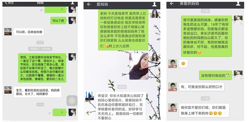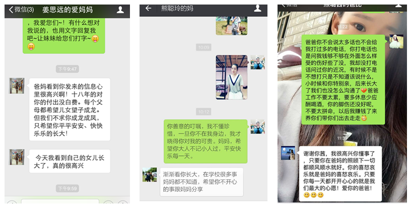 活动中,同学们都积极踊跃参与,纷纷拿出手机,把自己想对父母说却又不敢说的话用网络传递给父母,而父母的回答让同学们倍感温馨,让同学们有了努力的目标。即使有些同学的家远在千里,一个学期只能在长假时回家,但一条短信,一张照片就能让远在千里的父母安心。有的告诉父母自己在学校的生活,让父母不要担心;有的告诉父母自己在努力朝着自己的梦想前进;有的直接向父母表达想念之情。