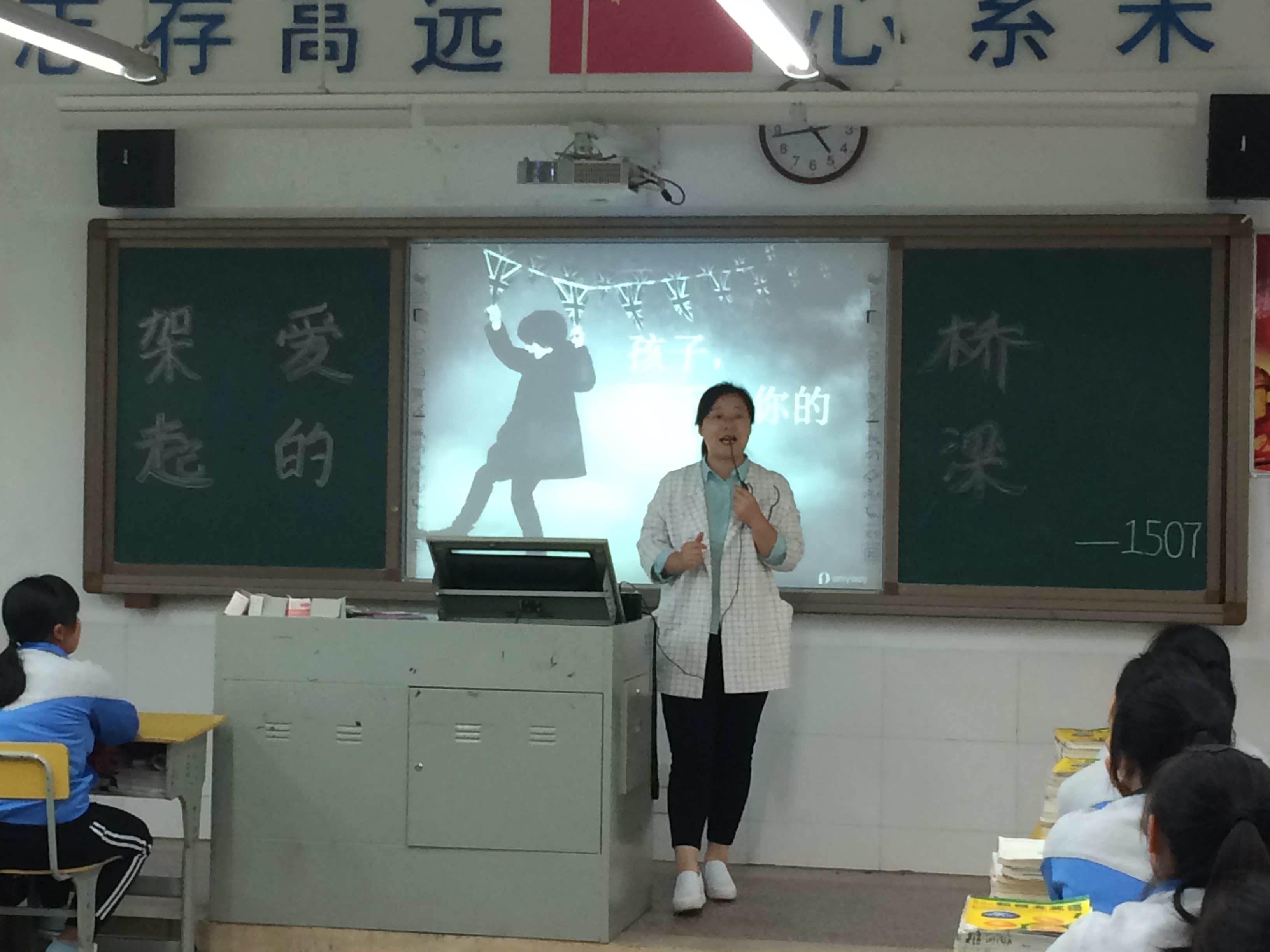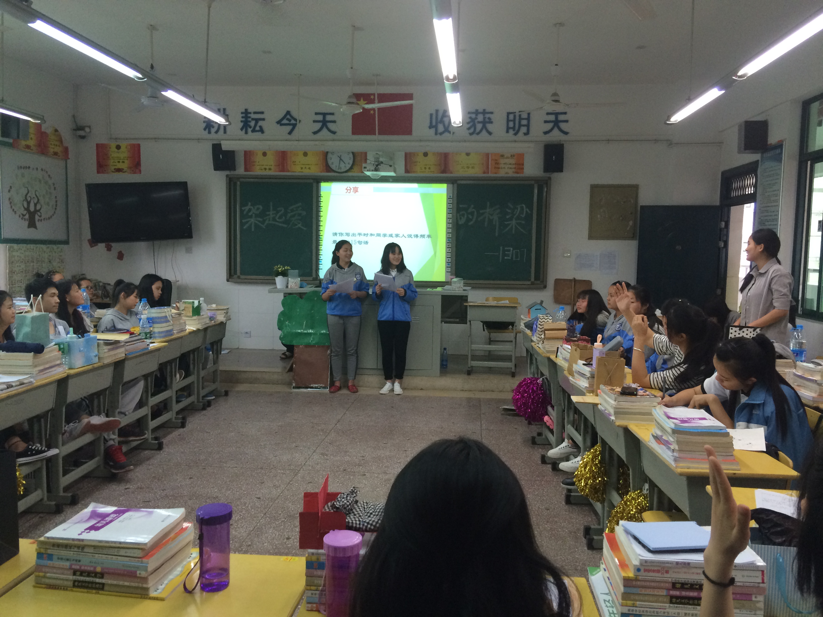 沟通是一门优美的艺术,怎样正确的跟父母的沟通,是本次班会主题的立点。本次班会,每个班级都做了精心的策划。1304班通过“爱的桥梁”游戏活动说出对“父母、陌生人、未来的自己”内心最想说出的话,让同学深刻理解克服自身的潜意识的回避能更有效的与人沟通。1507班将班会分成学生展示部分和老师主讲部分,通过学生的引入老师的升华,本次主题教育在1507班实现了充分消化。1403班尤为突出的亮点是情景剧,该情景剧讲述的是一位女儿看到父母在背后为她辛苦付出后最终蜕变的过程,触动了同学的心灵深处,使其理解到沟通需要换位思考。1513班、1307班1401班通过请同学们发言,每位同学通过讲述自己与父母的小故事以及内心感受、在学校接受国家助学金关爱的感受,这种种都是在人与人之间搭建一座爱的桥梁。1512班通过让同学们与母通电话并亲口对父母说“我爱你”,通过一则电话用温和的语言与父母架起了一座爱的桥梁。