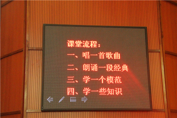 活动分四个环节进行,按照“道德讲堂”建设工作的要求开展,分别为:唱一首歌曲、诵一段经典、学一个模范、学一些知识。“唱一首歌曲”,采用了学生独唱、师生合唱等形式,在温馨、和谐的氛围中进行;“诵一段经典”选诵《三字经》;“学一个模范”选学湖南省道德模范周美玲同学的可颂精神;“学一些知识”则精细的讲解了《三字经——人之初》。