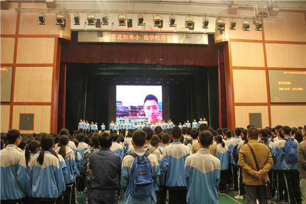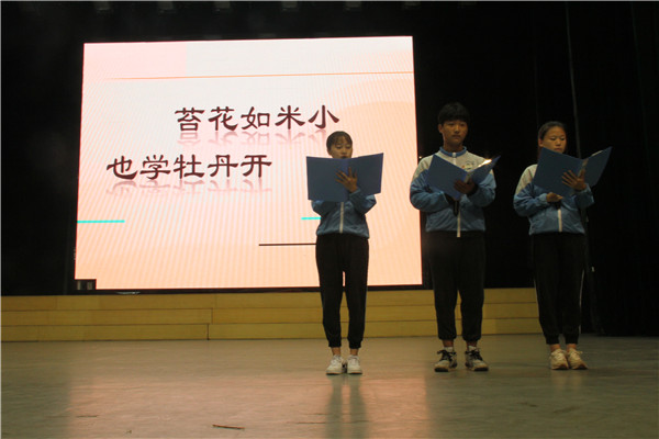 “苔花如米小,也学牡丹开”,苔花如米粒般大小就如同同学们,1517班的同学们鼓励大家要通过努力像牡丹一样绽放。他们通过分享1516班张昕豪的故事,提倡同学们向1516班张昕豪同学学习,学习他在困难面前阳光向前的精神。最后1517班同学通过演唱《星星点灯》结束了他们的演讲。