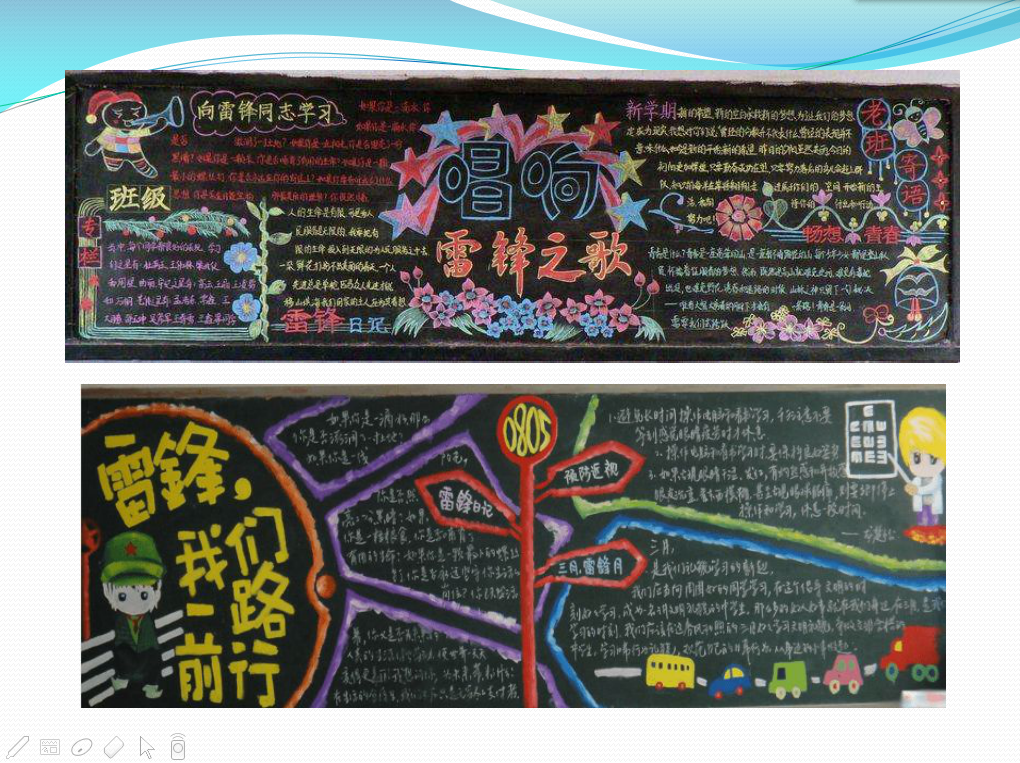 通过戴蔚蓉老师的授课,大家对黑板报的设计、布局、选材各方面都有了好的想法和创意。希望各年级各班积极准备,让每块黑板报都色彩鲜艳、布局优美、内容丰富,生动形象地诠释雷锋精神。