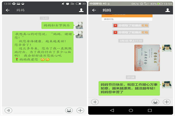 在三月雷锋月里,有的同学给妈妈发一条爱的信息、有的为妈妈写一封信、有的做一张贺卡放假给了妈妈、有的利用周末回家为妈妈或者奶奶干一件力所能及的事、有的精心设计一份送给妈妈的礼物,让妈妈微笑,每个人都在争取做爱护家人的小雷锋。其中1618班,借用主题班会的契机,给母亲写了些心里话,只看每个同学伏案执笔,将爱汇于纸张,字字真言;1609班则现场给妈妈打电话,说一句感谢,道一句问候;其他班级大部分同学,给妈妈或者女性长辈,发了短信或者微信,字里行间,温情十足。