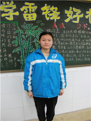 推荐词:外表大大咧咧不拘小节,但如此的外表下却有一颗善良且细腻的心。无论在学校还是班级中都能看到她乐于助人的身影,当你遇到困难时,她就会像个超人一样来到你的身边,尽她所能给予你帮助。在她担任团支书一职期间,尽职尽责,主动帮助老师和同学,对待工作和学习认真负责,她是一位真正具有雷锋精神的美德少年。
