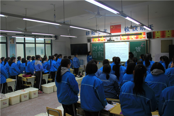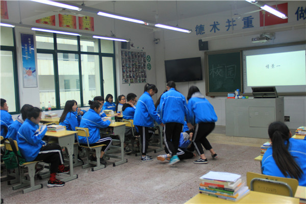 为了杜绝校园不和谐音符,学校组织各班开展了“对校园欺凌说‘不’”的主题班会。各班联系身边事例,组织得井然有序。例如:1507班以“不还手,忍”和“不能忍,打”为辩题,就遇到校园暴力如何处理的问题进行了全班性讨论;1602班将校园欺凌的含义、事例、解决方案都写在黑板上,并且每个人都成为内心强大的人,遇到状况,灵活应对;1612、1618、1617等班级,也能在停电的情况下,将班会主要内容抄写在黑板上,足以体现其用心程度;1603则是实实在在型,要求全班背诵家长、班主任、保卫科电话,将防范落到实处;1513班从如何不成为被欺凌者而努力,增强了同学们反欺凌意识,提高了同学们自身安全保护意识;1508、1510班在汇智厅合作开展班会,有助于交流和共同进步;1610班立点“不以恶而为之,不以善小而不为”不因一件小事而去伤害他人,我们应该善待他人、换位思考、包容宽恤;1614班从法律条例,警示同学们在校园欺凌中充当施暴者可能发生的结局;1511、1605等班级通过情景剧反应了身边的校园欺凌事件;1505班全班宣读倡议书,承诺坚决抵制校园欺凌;1502班给出“忍、和、恕、理”四种应对校园欺凌的方法,归纳合理和新意。