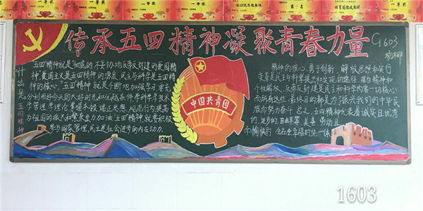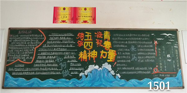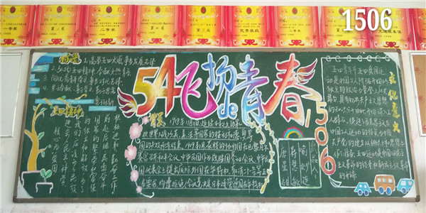 本次黑板报各班设计新颖,标题突出,内容丰富,色彩搭配好,大多数班级选择用五四青年的标志来进行主题画作,各班创意各具特色都十分别出心裁,1605班黑板报设计童趣可爱色彩搭配好让人耳目一新,1503班花边设计创意突出,板块分布清楚有序,1501班标题色彩突出采用渐变的效果,采用了每个板块有一个突出小标题的方法使人看了十分舒服,1610班插画新颖,也值得我们学习,本次主题黑板报大多数班级文字写的都为五四青年节的由来及五四青年节的导火索等等,而通过这次的黑板报使得同学们可以更加的了解五四青年节的各方面的知识。
