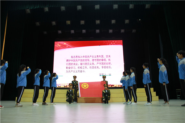 随着主讲人宣布进行入团仪式,新团员代表合着团歌的节奏踏上汇美馆的舞台,学生科银伶老师庄重的为他们佩戴上金灿灿的团徽,她们庄严的将右手举过肩高,跟着团委学生会黄薇的领誓,严肃地宣誓。从此,团组织又多了一批新鲜的血液,这批新团员也得肩负起为共产主义奋斗的使命。