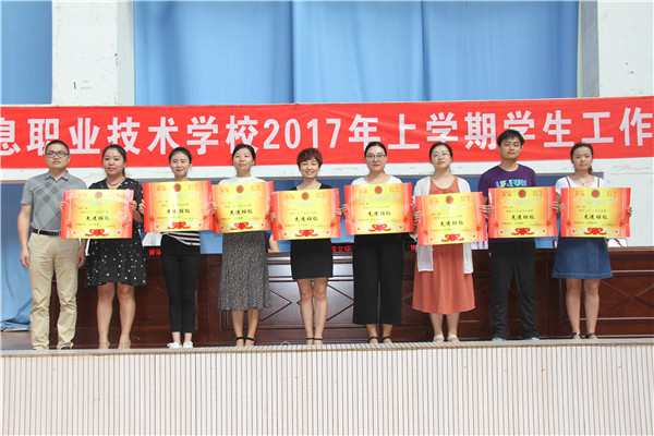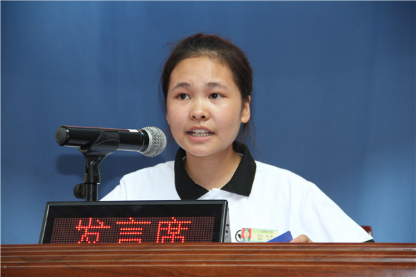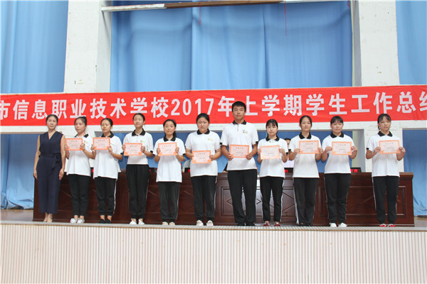 会上,周曦科长对2017年上学期学生工作进行了总结,既肯定了上学期同学们所取得的成绩,同时也为学生本学期的学习指明了方向,并对大家提出殷切期望:希望大家扬长避短,总结经验,改进不足,争取在这个学期取得更大的进步。彭繁珍副科长宣读了2017年上学期优秀集体和优秀个人获奖名单,并协同周校长、周科长、黄书记为获奖班主任及学生颁奖。接下来,学生代表1507班周娟发言,她说到:作为一名学生干部在平凡的工作岗位上要爱岗敬业,无私奉献;作为一名学生在学习上要刻苦钻研,在生活中顽强拼搏。她的发言鼓舞了现场的学弟学妹们,获得了雷鸣般的掌声。