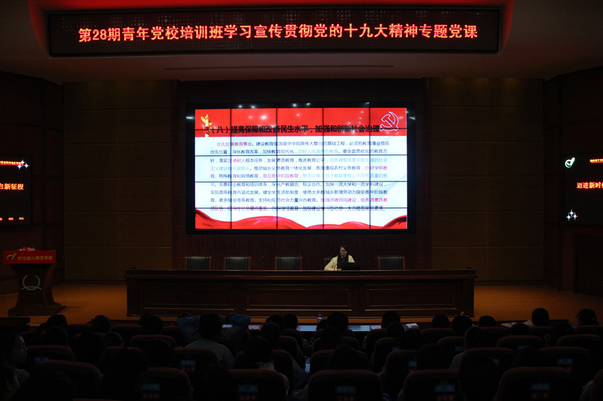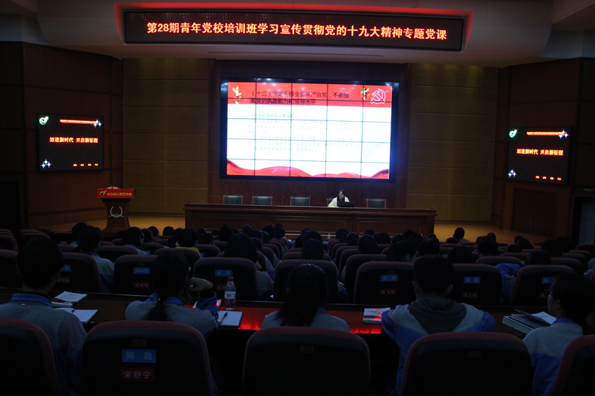 11月8日晚,长沙市信息职业技术学校于汇智厅举行了学习党的十九大精神报告会——做新时代新青年活动。团委黄丽辉书记作了题为“新时代 新青年 新作为”的专题党课,第28期青年党校全体学员参与了报告会。