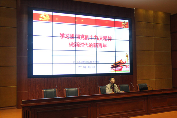为了切实抓好学习贯彻中国共产党第十九次全国代表大会精神,进一步在校内掀起学习宣传贯彻十九大精神的热潮,11月19日晚,学生科组织班主任在汇智厅集中学习党的十九大精神,学生科周曦科长作了《学习贯彻党的十九大精神 做新时代的新青年》主题讲座。