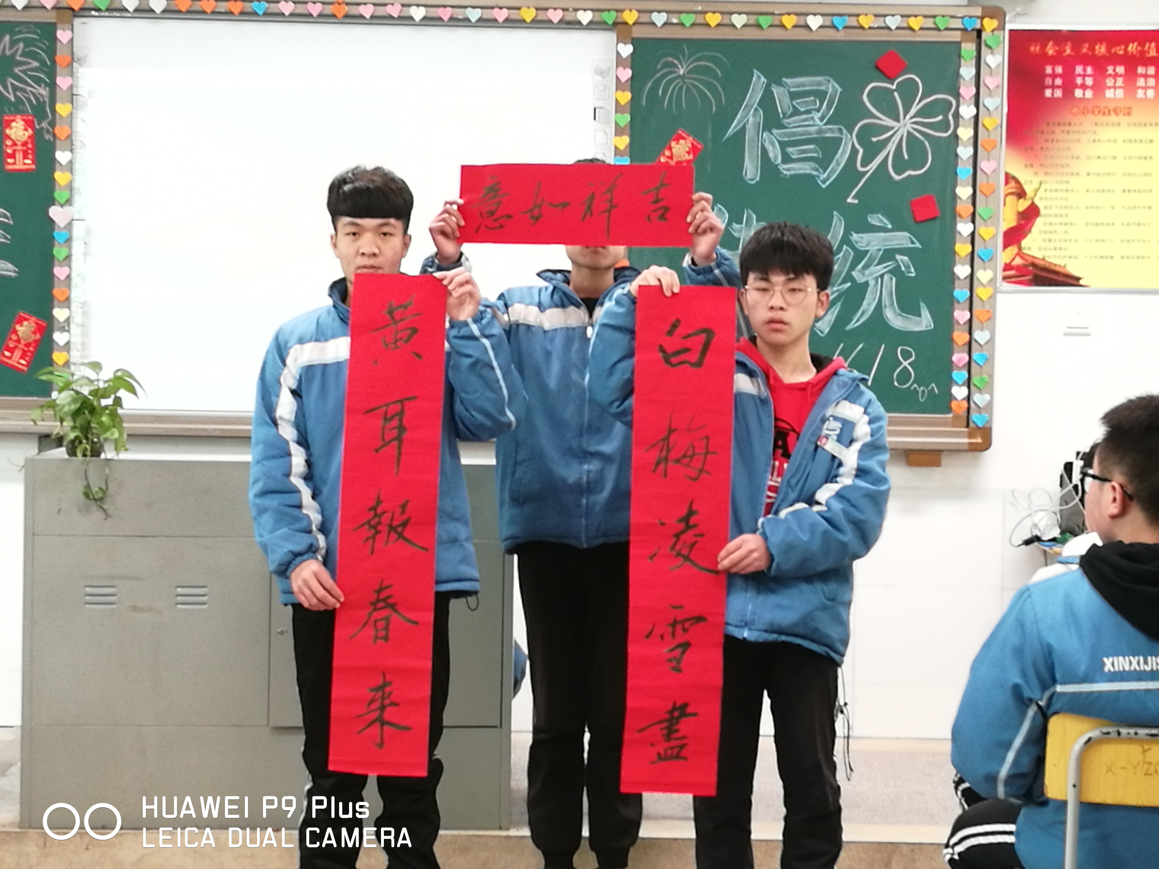 第二个环节是春联现场展示。班级事先邀请了美术组李剑波老师作了一幅春联,并将其创作过程拍成了视频供现场播放,现场主持人讲述了春联的由来和深意,提倡同学们平常多发展自己的兴趣,认真对待每天的晚习字时间,练就一手什么时候都用得上的好技能。看完视频和春联后大家都感慨万分。