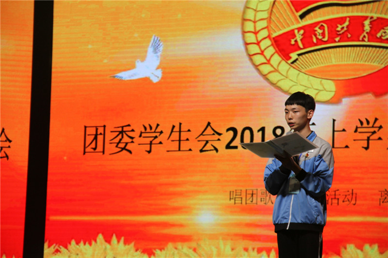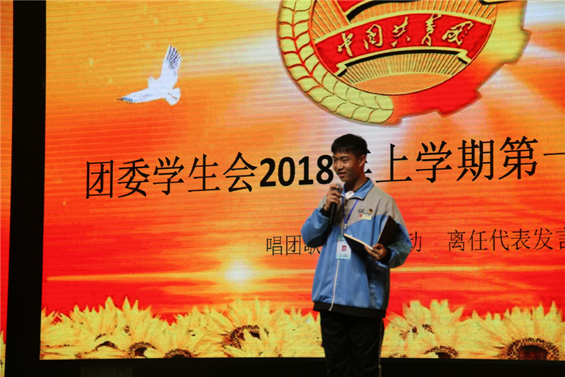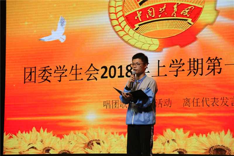 学科部部长丁世龙代表即将毕业的学生发表了离任心得,他说两年了,从一名国旗班成员到国旗班班长再到学科部部长,他看到了自己的成长,同时在学习和工作中也严格要求自己,很多人都不知道他曾经是一位连踢正步都会垫脚的学生,为了更好的完成工作,他不段的利用休息时间练习,最终有了很好的呈现。他说天行健君子以自强不息,希望学生会的成员认真尽责的完成工作。