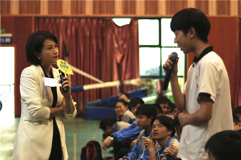 针对青少年艾滋病知识缺乏,防控知识了解片面,对艾滋病蔓延的危机感和自我保护意识淡薄等情况,陈小英深入浅出地为大家讲解了艾滋病的致病原理、发病状况、传播途径、防治措施等相关知识。通过生动的事例、大量的数据以及令人触目惊心的图片,让全体学生深刻了解了艾滋病的危害,知晓了有效防控艾滋病的具体措施。通过生活小剧场《三分钟》告诉学生:我们应该主动了解和正视艾滋病,对艾滋病病毒感染者及艾滋病病人多一点理解与关心,少一点歧视与批判,这世界就会变成美好的人间。为了巩固大家对本堂讲座所学内容,王欢利用模拟情境提问互动。她的主持幽默风趣,又不失内涵,现场气氛非常活跃。同学们纷纷举手,表达自己的观点,“每个人应该为自己负责,为她负责。”“不为男生的甜言蜜语所诱惑,坚持自己的原则。”妙语连珠,思想独到,全场掌声热烈,经久不息。最后,陈小英带领全体宣誓:尊重生命,不伤害他人,以积极健康的身心创造美好未来。