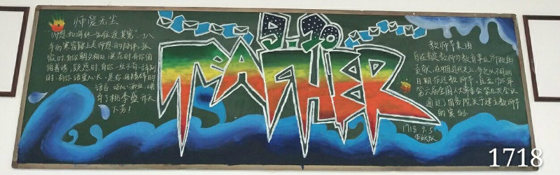 在教师节快来临之际学板举办了以“师爱无尘” 为主题的黑板报评比,让同学们写下对老师无尽的爱,在本次黑板报评此中,有许多的班级积极参与,画出来的作品更是让人眼前一亮,二年级中1702班以海为主题颜色, 因为师恩似海深,更充分的突出了对老师的爱至深,1703班的特色在于中间的印章,更能突显出主题,字迹工整,1710班以一棵樱花树为版面,字体更是以POP字体为题.