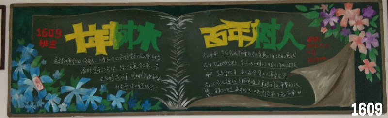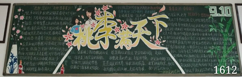 三年级中1607班,以撞色的形式,把整个黑板报的排版会画的栩栩如生,把对老师的情感,融入在黑板当中,形成为一个整体。也体现了老师与学生的情怀。 1609班,以温馨的格调,体现出一日为师,终身为父的形式。主题突出,配色恰当,排版工整,给人眼前一亮的感觉。1612班,以最简单的形式,体现出最工整最丰富的感觉。主题突出,字迹工整,富有诗意。