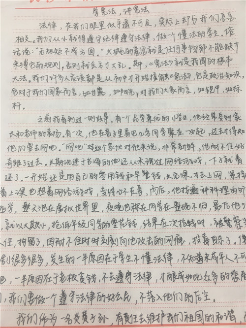组织学生征文比赛。本周我校展开了以“学宪法 讲宪法”为主题的征文比赛,要求各班联系实际讲述生活中学法讲法的重要性。评比出1612班李灵芝、1613班刘琛、1709班杨广霞等优秀文章。