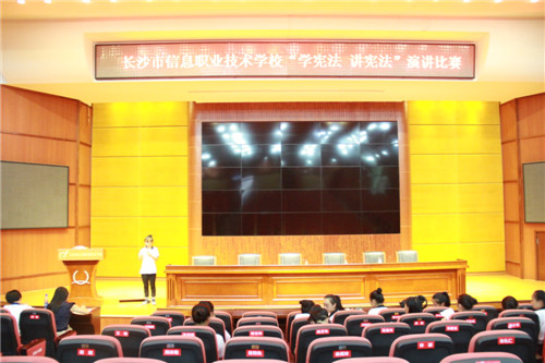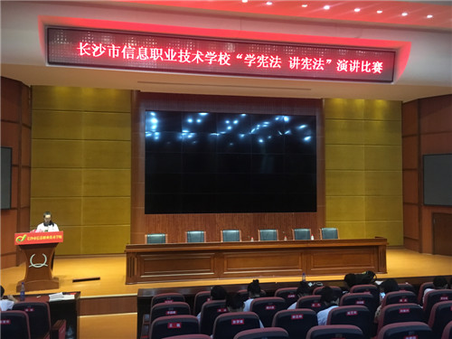 开展学生演讲比赛。9月18日“学宪法 讲宪法”演讲比赛在我校汇智厅展开,本次比赛学生踊跃报名,十分积极,他们把鲜活的事例、学法的感受,全都用激情飞扬地演讲来演绎,把普法活动推向了高潮。1719班谢宇欣、1603班陈好、1603班李美慧、1611班杨丹等同学在演讲比赛中表现突出。
