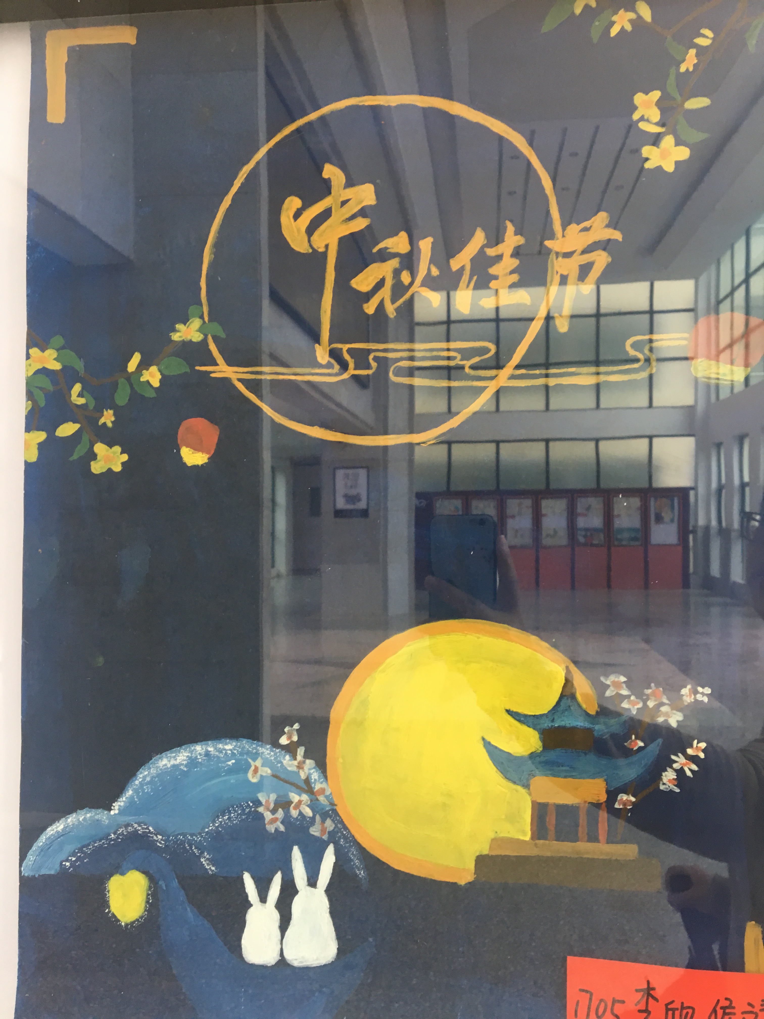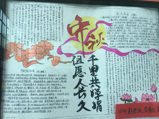 海报方面更是不用说了。其中,1704、1705、1709、1711班表现突出,海报绘画了月亮及玉兔的人物形象,并色彩突出,简单明了,很直观的绘出了“喜迎中秋,月入梦圆”的主题,使版面独具一格,别有韵味。比例恰当,疏密有致,松紧适当,文章精悍,图文并茂,格外吸引大家的眼球。