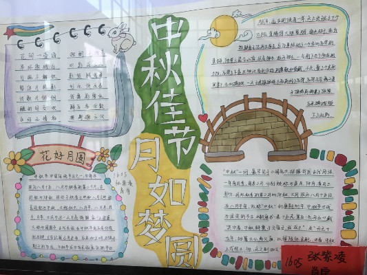 在手抄报方面,大家都以颜色鲜艳为主,1605、1604、1603、1612,用彩色字体写明主题,用彩色字体写明标题,明亮简洁、内容明确,字迹工整。而1603班的特色在于插画优美,字迹工整,总体看上去十分简洁明亮、1604班字迹工整,插画十分漂亮、从版面看上去有一种意境的感觉。有些班级的手抄报主题字运用了POP字体,并用水粉染色,简单大方,主题突出,而1605、1612班玉兔月亮的形象用了q版绘图,用色鲜明,从而整体的手抄报主题突出,吸引他人的注意,从而达到很好的视觉效果。