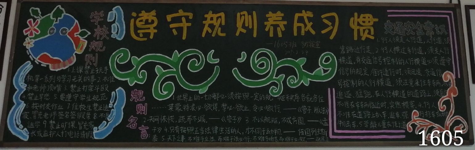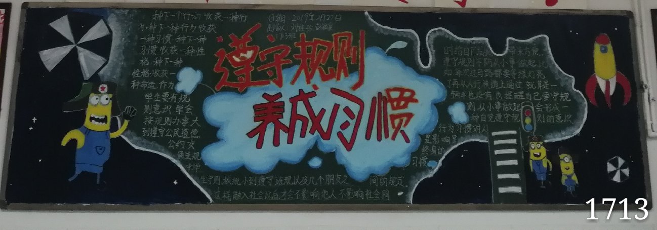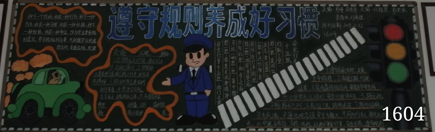 如果火车没有受轨道的约束,就会倾覆;飞机没有受航线的约束,就会坠落;生活处处需要规则,也需要人们遵守规则,这样生活才会有秩序,而不是乱成一锅粥。因此,我们绘制了以“遵守规则,养成习惯”为主题的黑板报。