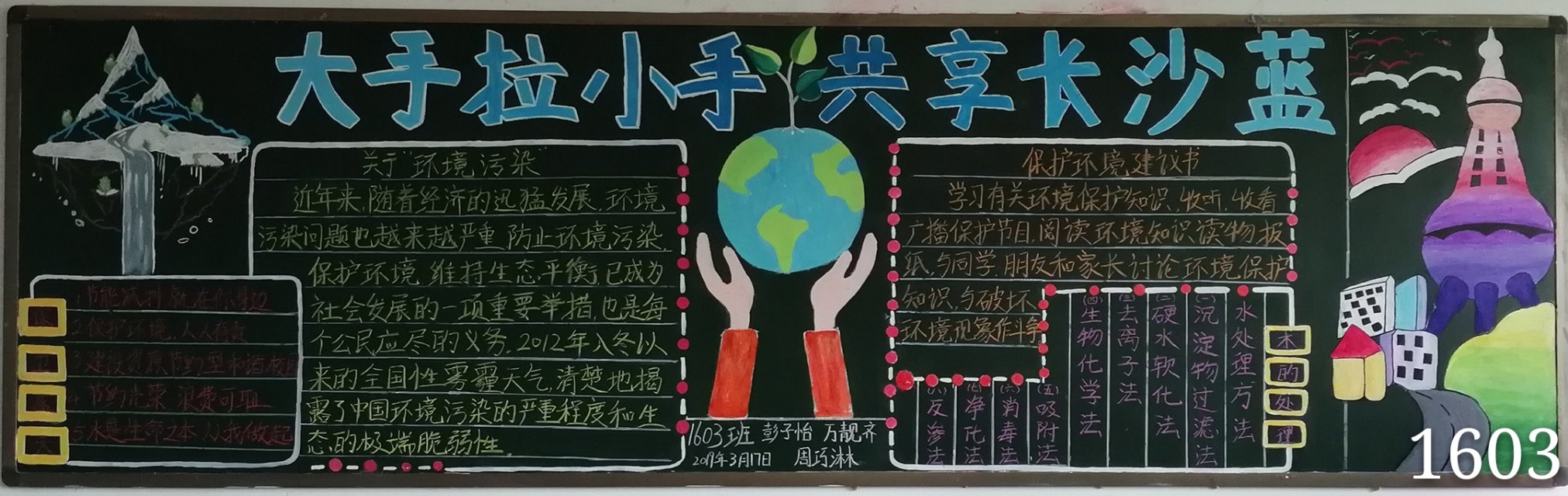 黑板报:1603画了地球和简单的边框绘画东方明珠用了紫色渐变很有特色;1604画了双手捧着地球大部分用了蓝色渐变还用了可爱的动物卡通图案很有特色;1605运用了简单的卡通人物,标题字体颜色丰富,大部分用字体构图。