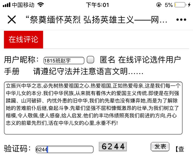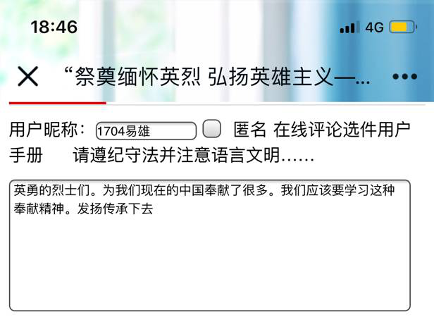 活动负责人1802孙文君组织全校师生登录中国文明网参与“传承英烈精神立志报效祖国——网上祭英烈”网络文明传播活动,学校近2000名师生在网上寄语留言,表达对革命先烈的感恩怀念和景仰之情。借此机会,利用课余时间,学生在中国文明网上点击相关信息,了解英烈革命事迹,学习英烈爱国精神,向英烈献花、留言,表达缅怀之情。 1702班卢如靓雪在留言中说道,一个民族光荣的振兴,离不开壮士的奉献;一个民族屈辱的洗刷,离不了烈士的身躯。革命烈士们,你们生的伟大,死的光荣!我作为祖国新时代青年,在这里向你们奉上最崇高的敬意! 1605班李晓玟留言道年年祭扫先人墓,处处有犹长春风,学习先烈革命精神,为振兴中华建功立业,不忘烈士抛忠骨,民族复兴中国梦;1804班孙文静留言道清明将至,缅怀先烈,我们现在的幸福生活是你们用生命换来的。珍惜当下,向你们致敬!