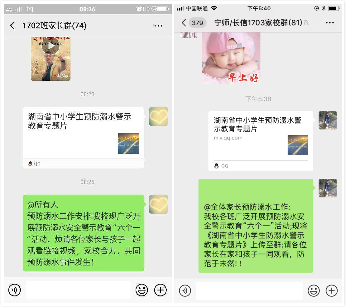 一是班主任利用全国学校安全教育平台进行防溺水专题授课,结合《湖南省中小学生的防溺水警示教育专题片》以及学校学生实际情况对学生进行防溺水教育;二是利用5月5日至5月11日的晚自习时间要求各班组织学生集中收看《湖南省中小学生防溺水警示教育专题片》,人人撰写专题片观后感,将安全防范意识刻入脑海;三是班主任转发《湖南省中小学生防溺水警示教育专题片》至每位家长,通知家长在家与孩子一起观看,要求家长在《关于防溺水的至家长的一封信》回执上郑重签名,承诺将教育好,监管好孩子,防止溺水等意外事故的发生,实现家校合作,携手共筑安全防线;