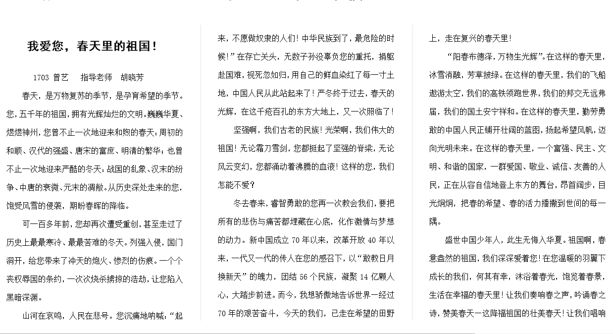 征文比赛由语文教研组承办,同学们收到征稿通知后,积极投稿,用青春的文字抒发对祖国的热爱,或朴实真诚地阐述心中的梦想,或客观真实地剖析社会问题,或热情真切地提出对祖国的期许。