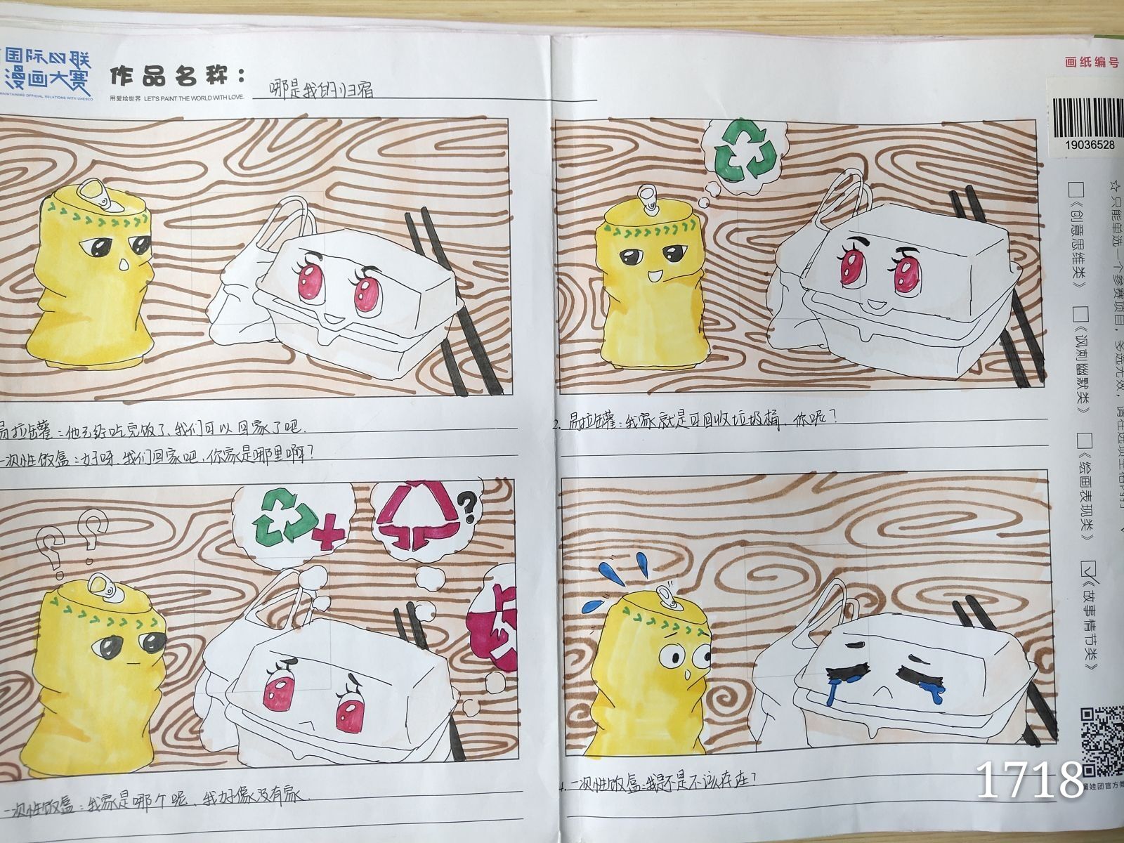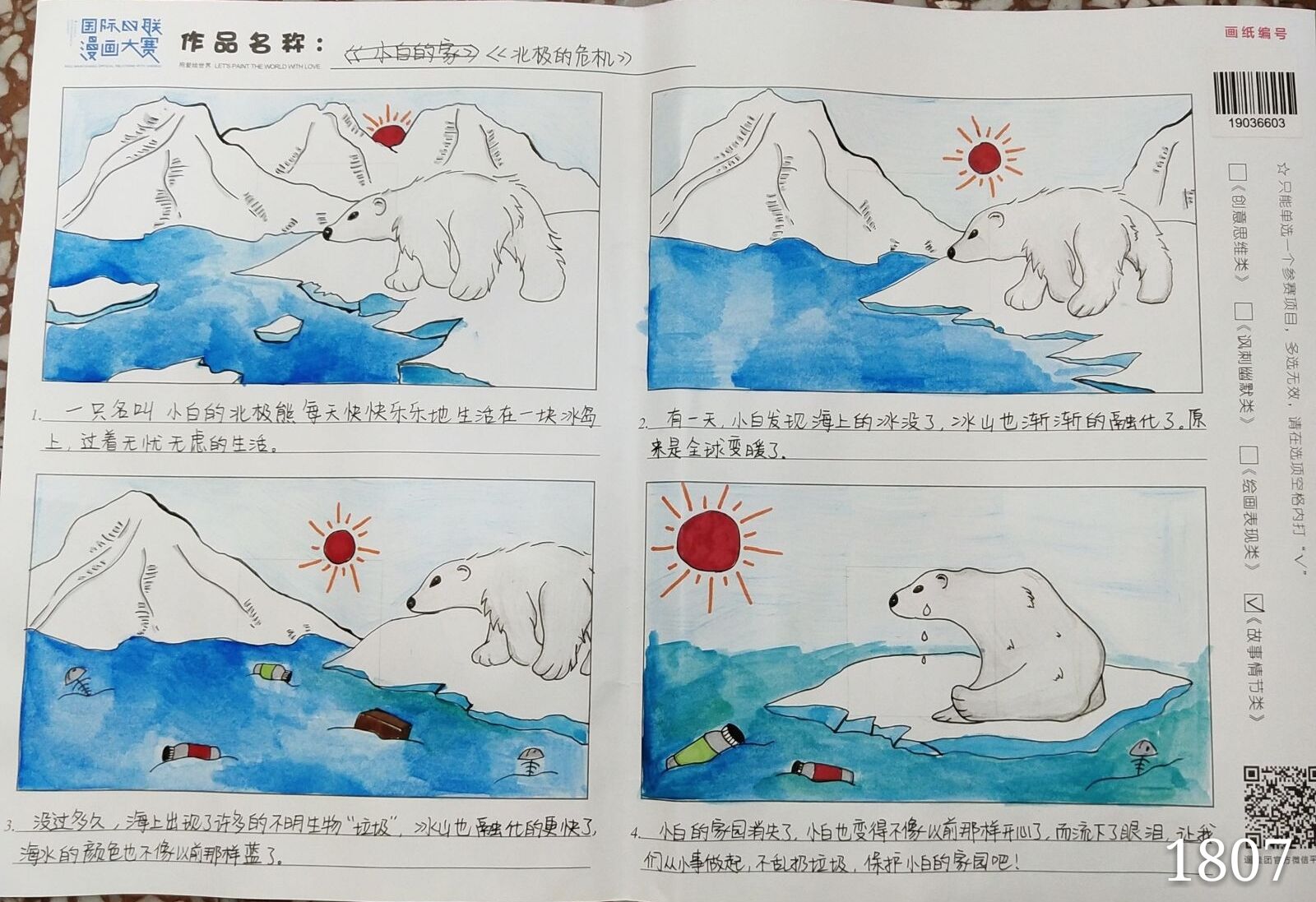 1604班构思新颖巧妙,在充斥着恶臭的垃圾环境中找到了无价之宝的小树苗。绘制带上眼镜后的画面细致而形象,上色均匀且色彩以暗色为主去绘制垃圾与塑料,与最后发现的树苗形成对比。1718班描述了可回收的易拉罐与不可回收的塑料餐盒的对话。1807班勾线粗细有规律,以河流为主题,讲述在环境的破坏下一条小河的故事。画面细致,运用了许多装饰方法如点、线、面等。1811班绘制简单明了,主体清晰,人物形象生动而有趣。上色方面使用了彩铅,涂色较为均匀。1705班使用了渐变的手法,过渡均匀而自然,全篇的基调为灰色,因此保护环境的宣言就更为突出。1807班描述了白熊因全球变暖和塑料侵袭而失去家园的画面。线条有粗有细,增加了冰山的立体感。水的描绘使用了渐变的手法,更加形象。
