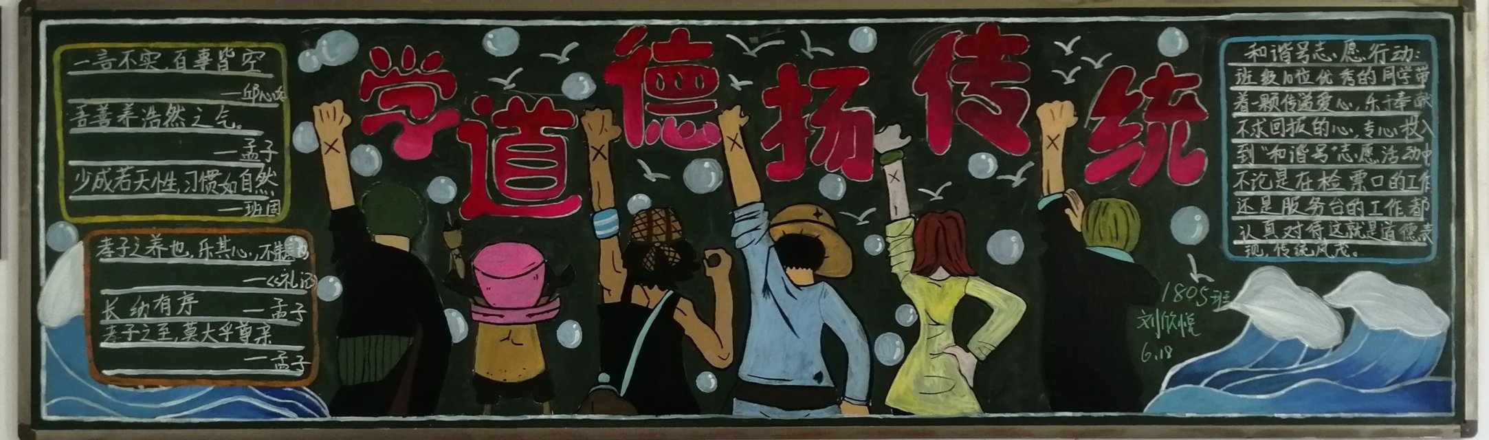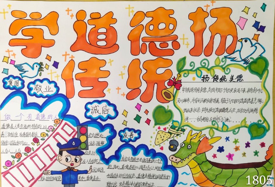 在这个21世纪,科技不断的提升,而我们的道德也在慢慢的改善,在校园中,我们不要作弊,要讲诚信。在社会上,要讲究素质,不随地乱扔垃圾。为了弘扬和宣传更好的中华传统美德,因此,我们开展了以"学道德模范,扬传统美德"为主题的板报绘制活动,让同学们更好的了解到美德和素质的重要性。