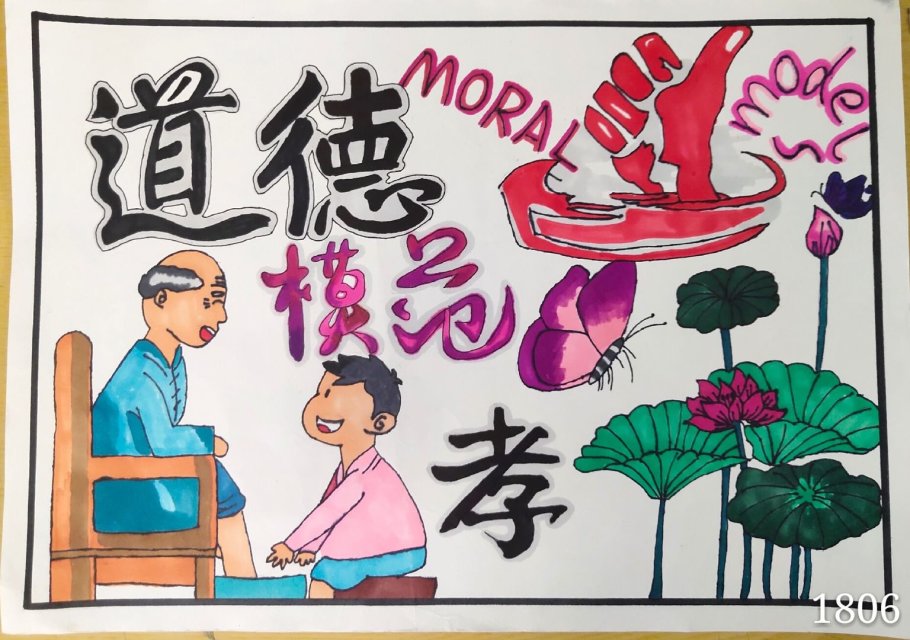 1806班的手抄报是以道德为主题,图中有红墙,荷花,红墙跟荷花画的栩栩如生,一下子就吸引了我们的眼球。1807的手抄报是以红色和黑色为主题,pop字体画的很好看,字体的背景为黑色,更加突出了主题。1811班海报字体画了阴影,使字体更加立体,也有种穿插的感觉,让中间的画更加突出。1810班手抄报以书本的形式,将内容写在了里面,让整幅画有种书香的气息。