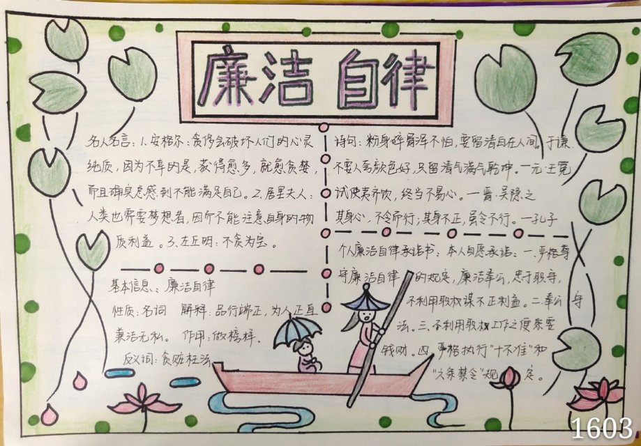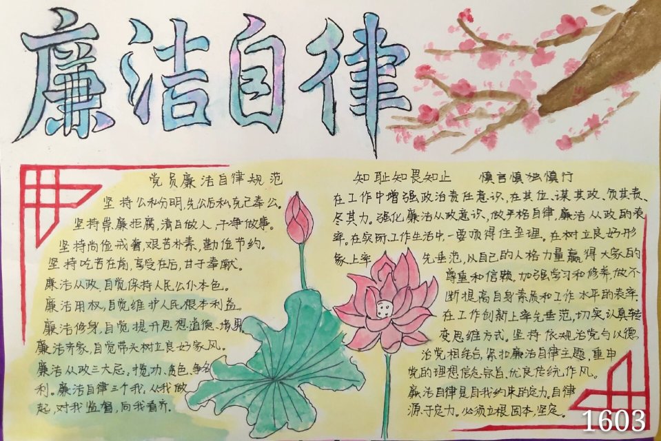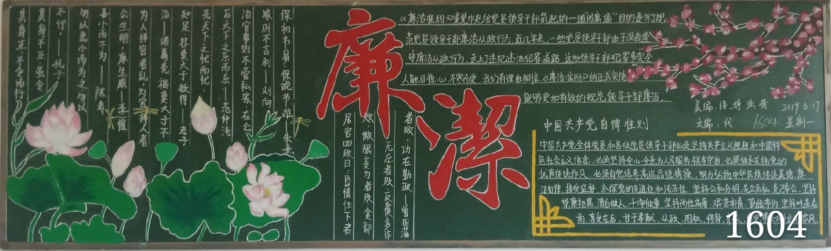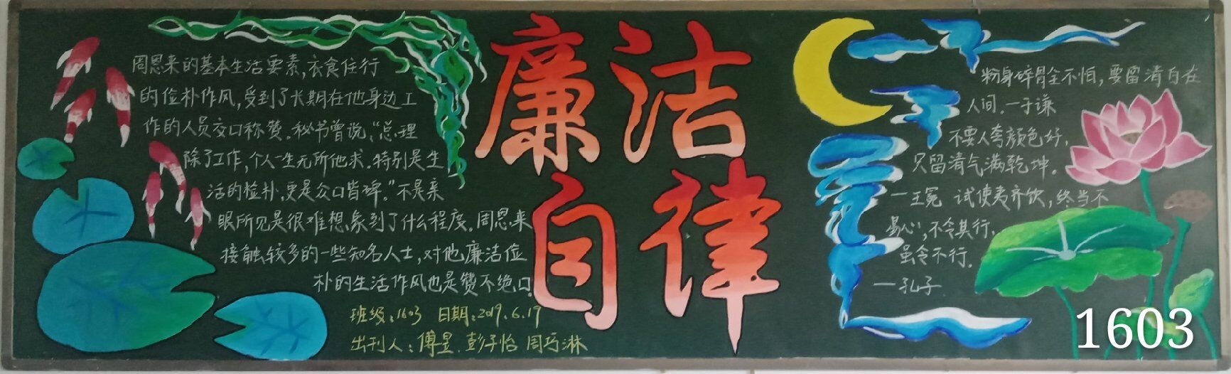 1603班绘制了荷花,荷叶以及锦鲤等形象,望着那粉嫩嫩的荷花,令人不由得想到。“出淤泥而不染,濯清涟而不妖”的荷花高洁精神。1604班则不仅绘制了荷花,还绘制了傲然于风雪之中的梅花,“廉洁”两个大字正挥舞在中央,相信1604班的同学对于廉洁这一个意识也根深蒂固了吧。1605班则在黑板中央绘制了一个大大的中国结,并且誊抄了《爱莲说》一文,右边还写下了自律准则等内容。使同学们对于廉洁以及自律这两个词语有了更深刻的理解。