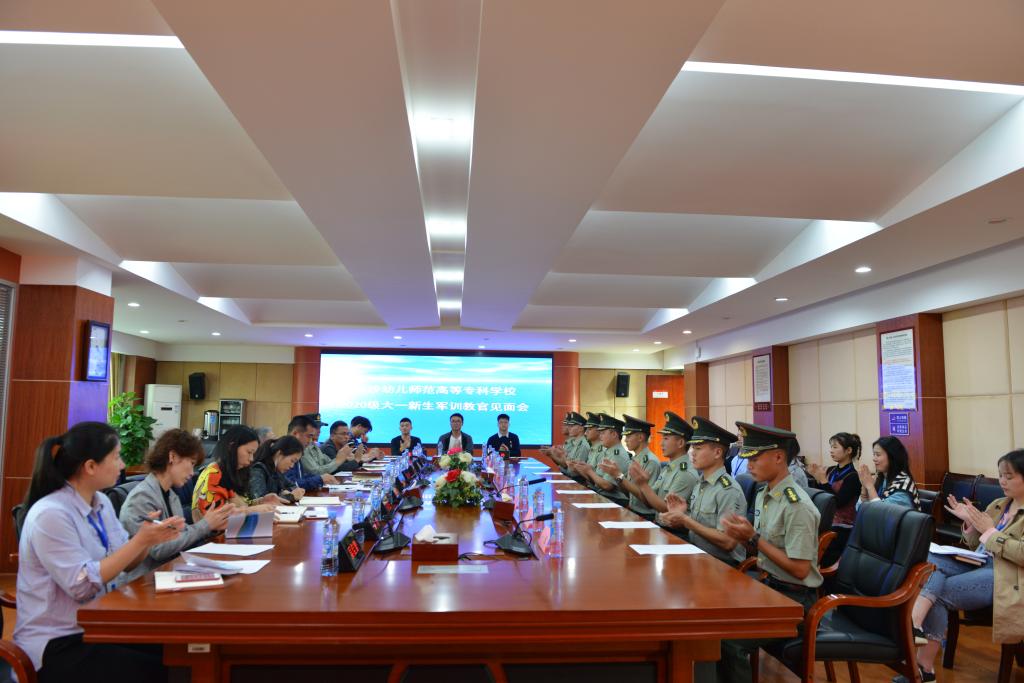 军训是大学第一课,为了弘扬军队光荣传统,建设优良校风,推动新生军训工作顺利开展,2020年10月10日下午,我校在广益厅召开2020级大一新生军训教官见面会。校党委书记张国斌,副校长文孟飞,学生工作处处长彭繁珍,后勤财务处处长周斌,安全保卫处副处长余金凡,学生工作处副处长李伟强、彭亮,学前教育系主任阳艳波、副主任兰帅,艺术系主任伍莉、副主任戴申林,教育技术系主任吴佳蒂、副主任王潇翔出席见面会。全体承训教官、全体新生辅导员以及校医邓宣彤参加见面会。会议由文孟飞主持。