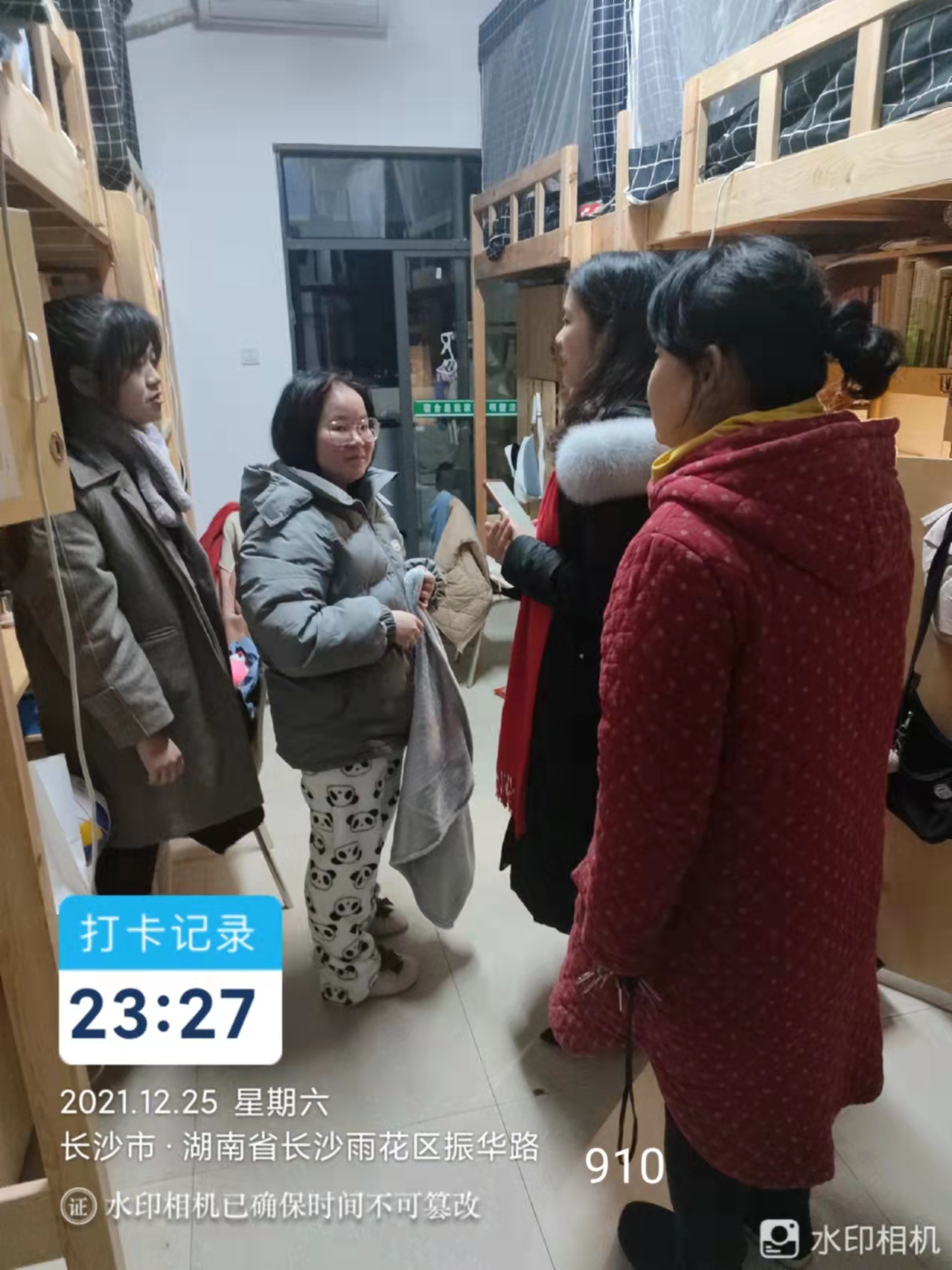 12月25日晚,学工处处长彭繁珍、副处长彭亮、宿舍管理专干邹雯辉老师以及大专部全体生活老师带领团学会宿管管理委员会的学生干部们组成了“突击检查小分队”共同开展突击查寝工作,对学生晚归寝情况、大功率电器及违规物品进行抽查。在查寝的过程中,老师们十分关心同学们的生活、学习情况,并叮嘱同学们仍需注意疫情防控,另外气温骤降感冒多发,同学们应根据天气情况添衣保暖。