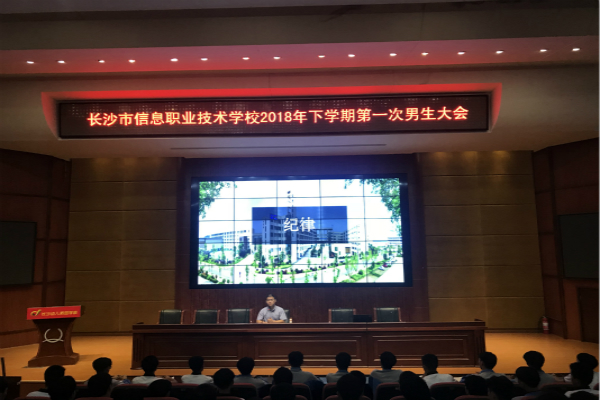 为了提高我校男生的安全防范意识和纪律意识,加强寝室内务和卫生管理,2018年10月7日晚,长沙市信息职业技术学校全体男生在汇智厅参加2018年下学期第一次男生大会,全体男生班班主任及全体男生与会,大会上,学生科王潇翔老师以及学生科副科长彭亮相继发言。
