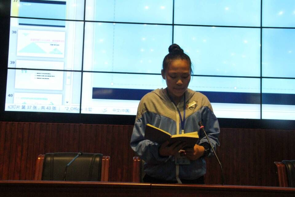 随后,学生会主席唐玮就她在天津参加的全国学联二十六大中、高职委员会议进行经验分享,主要对机会、努力、热心、心·技·气、自信、务实等六点进行解释。会议进行到最后一项,1403杨殷茜茜竞选代理副主席,15届干事徐非、伍慧娴竞选广播台副台长,之后银老师给大家机会让大家临场发挥,竞选自己想要竞选的职位,虽然更多的是在上台竞选与不竞选之间犹豫不决的成员,但也有自信的干部大胆的表达了自己的想法。银老师告诉大家机会都是靠自己争取的,希望大家在六月份的换届大会上好好展现自我。