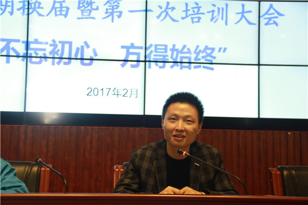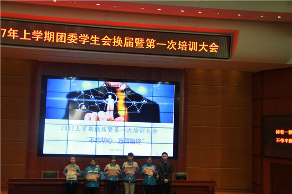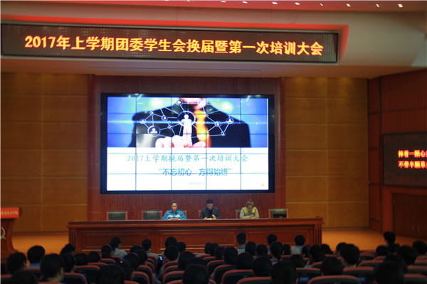 3月2日,我校2017年上学期团委学生会换届暨第一次培训大会在汇智厅举行,本次大会主题为“不忘初心,方得始终”,主持为1504班黄薇同学来主持,参会人员有学生科周曦科长、银伶老师和学生会全体成员。