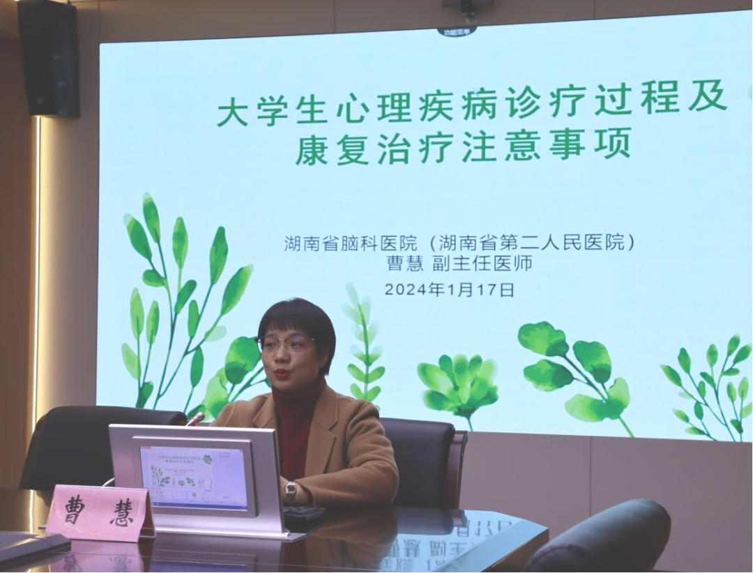 签约结束后,曹慧以《大学生心理疾病诊疗过程及康复治疗注意事项》为题作专题讲座,她结合丰富的临床经验,生动、详实地阐释了精神心理疾病分类、诊疗过程、康复过程三个方面内容,还为现场的辅导员答疑解惑,她深入浅出的讲解方式帮助大家清晰地了解如何识别与干预大学生心理问题。